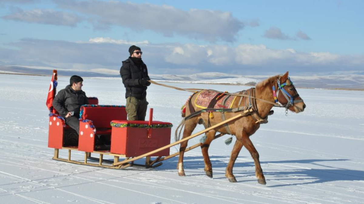Aslan, “Çıldır gölü buz tuttu. 15-20 santim aralığında buz kalınlığımız var. Atlarımızı çıkardık, atlı kızaklarla gezinti yapıyoruz. Kar motorlarımız, atlı kızaklarımız hepsi gölün üzerinde gelen misafirlerimizi Mart ayına kadar ağırlamaya çalışacağız” diye konuştu.